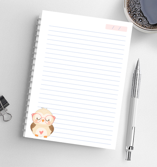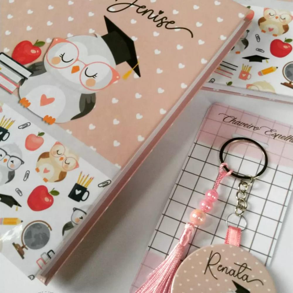 Kit com 1 caderno e 1 chaveiro espelho personalizado com temática de coruja para professores